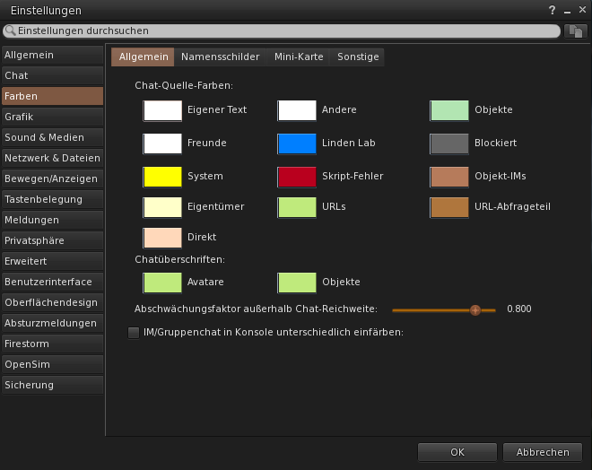 Auch hier habe ich bei mir nichts weiter geändert. Es besteht hier die Möglichkeit, das Farbprofil für IM-Cat, Chat, Systemmeldungen, An- und Ab-Meldungen und vieles andere nach seinen Wünschen einzustellen.